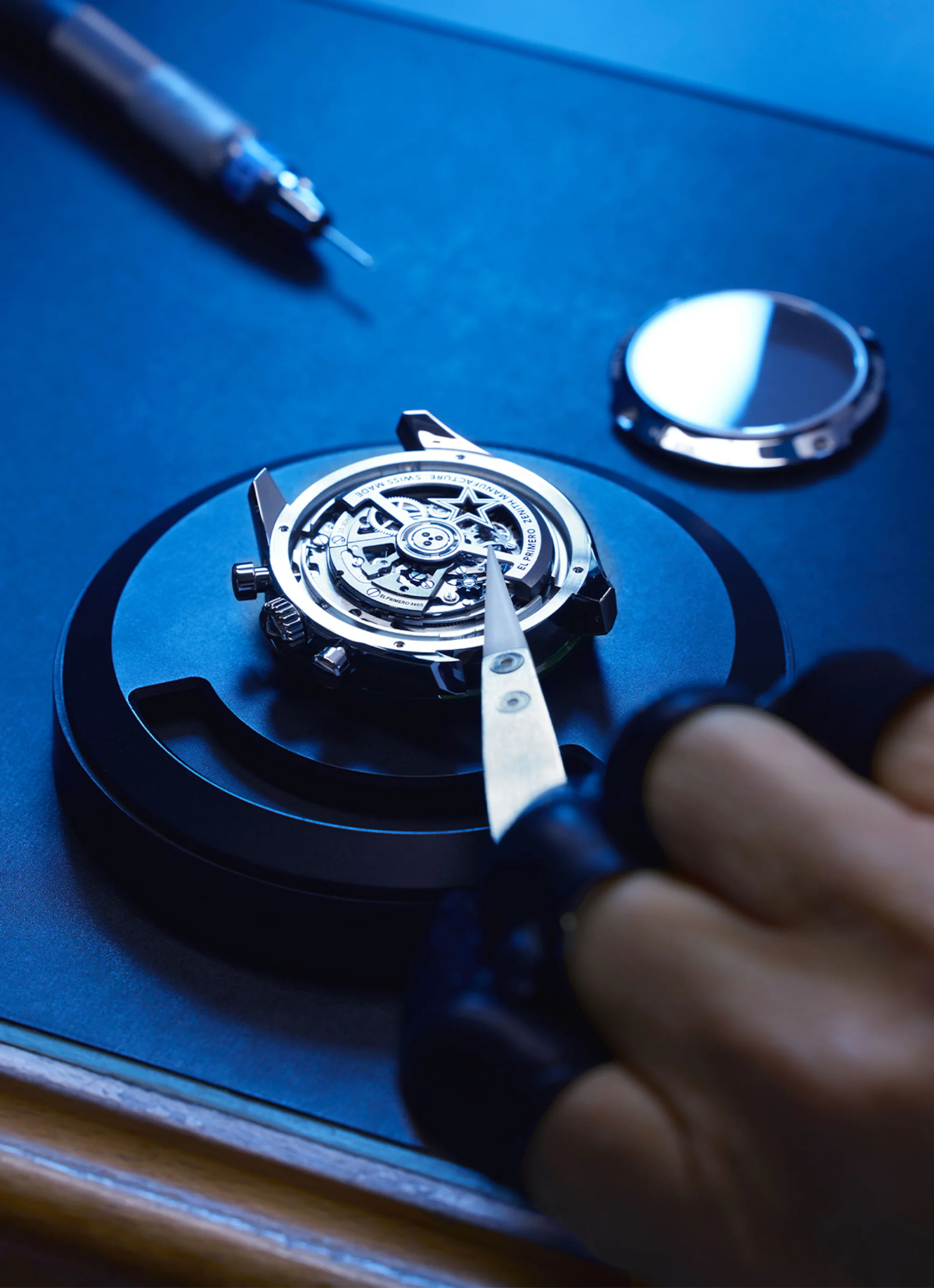 Keep your watch away from prolonged moisture and extreme temperatures.Clean gently with a soft dry cloth. For wooden parts, a touch of natural oil or beeswax helps preserve the finish. Always remove the watch before swimming or bathing.